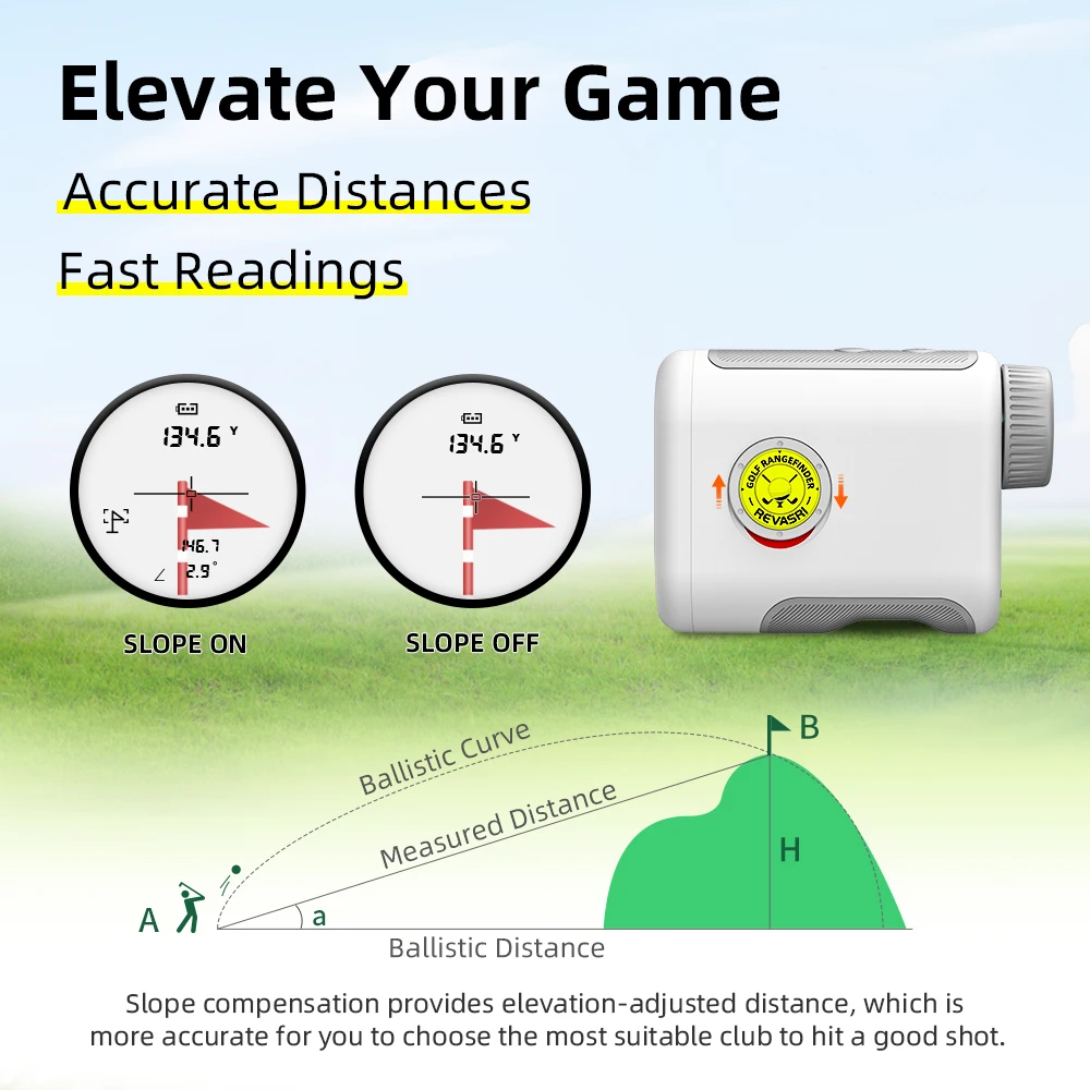 4.Turn on the angle switch and golf mode with flag locking vibration and slope compensation distance function.