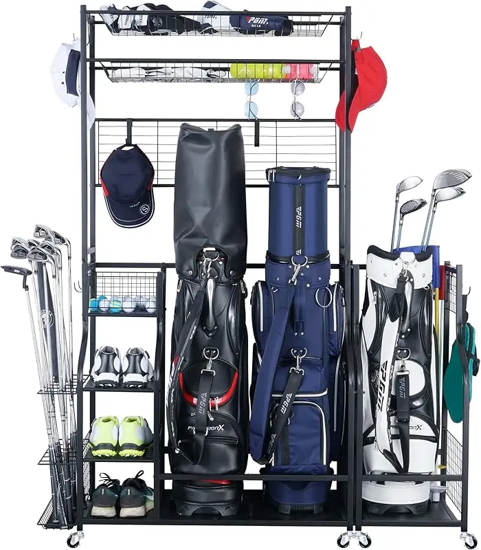 • Our golf rack can storage 2 golf bags, have a side rack for golf clubs as well as top rack for your golf accessories.