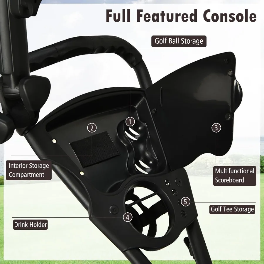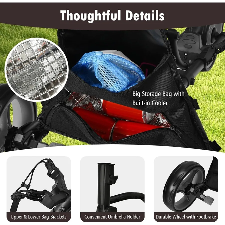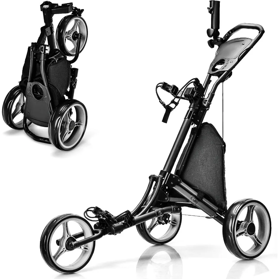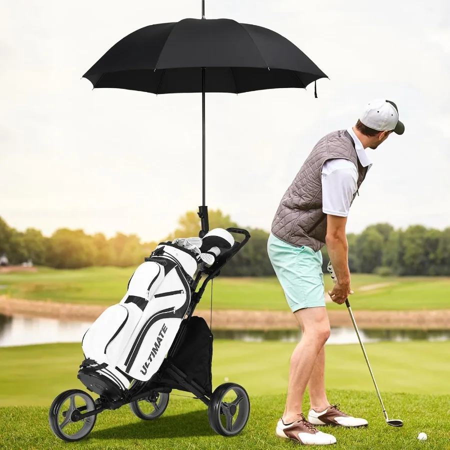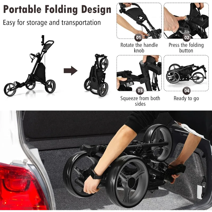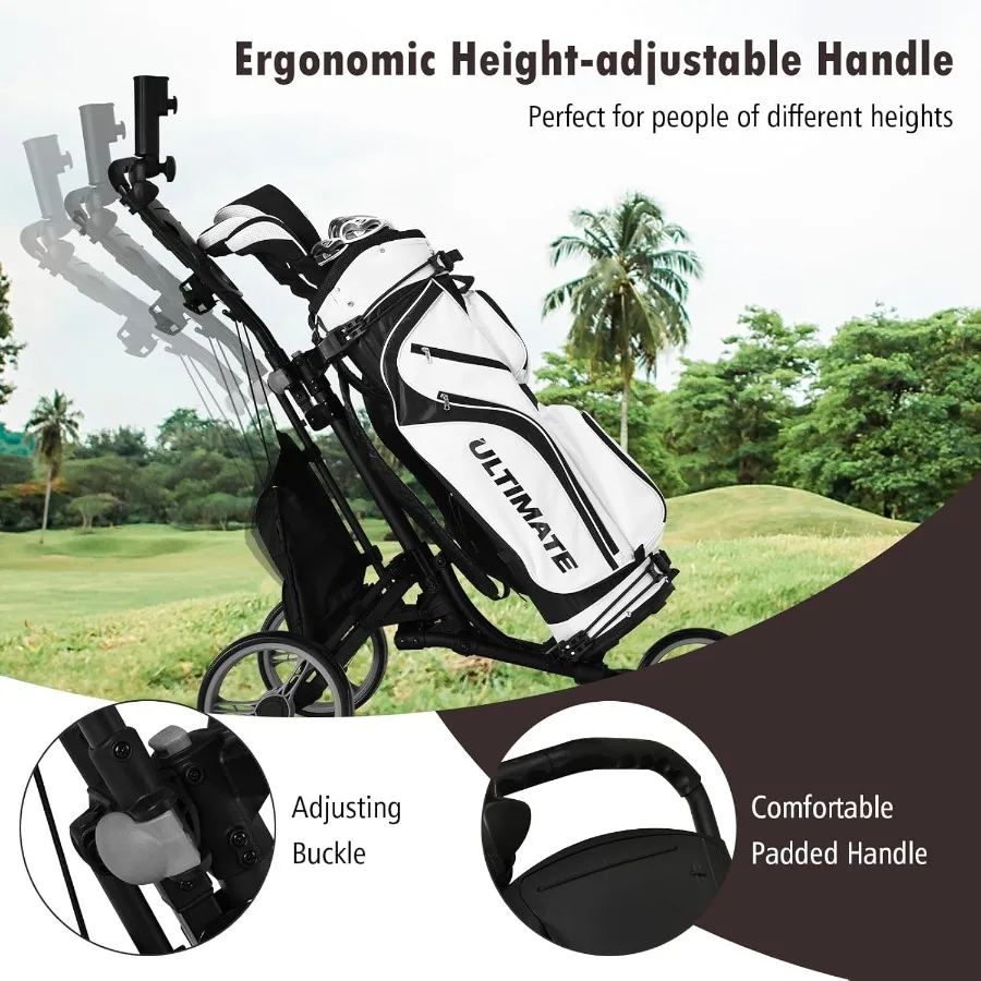 3 Wheel Golf Push Cart with Aluminum Frame for Easy Transport and Storage Features Elastic Strap Umbrella Holder Cup Holder Sco