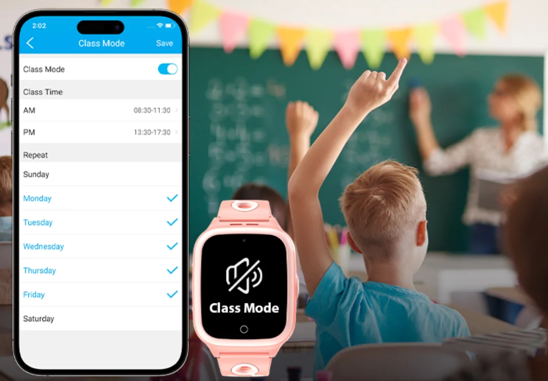 Parents can schedule Class Mode via the Leefine app, ensuring the watch operates silently and without interruptions during important moments.