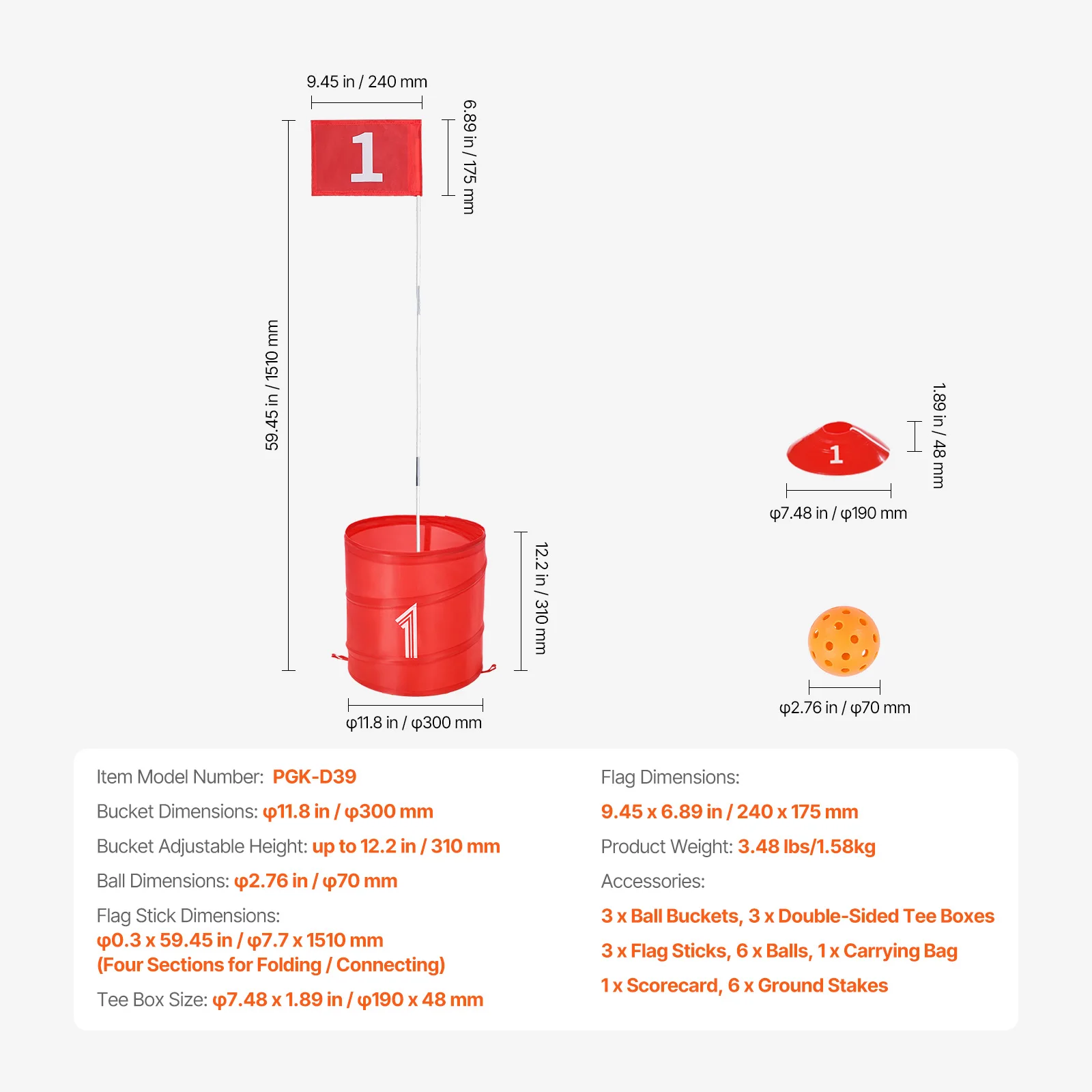 • Golf Ball: The 2.76 in / 70.00 mm pickleball is larger and easier to hit, making the bucket golf game suitable for beginners and children.