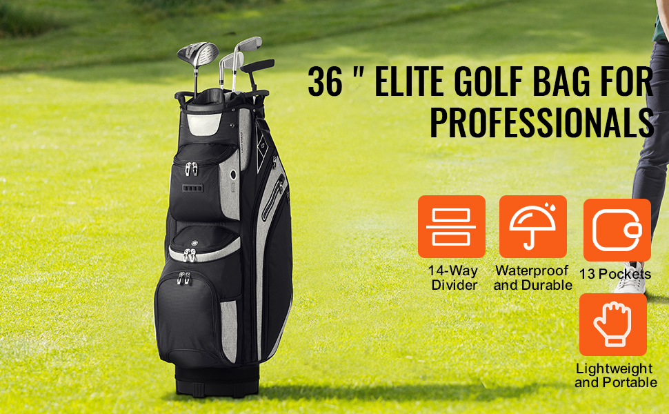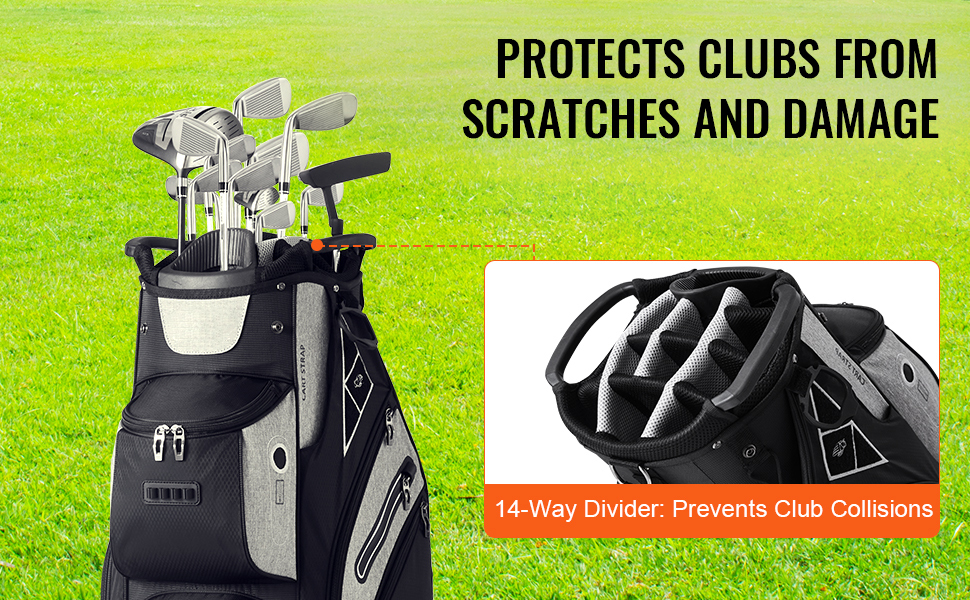 • Effective Club Protection: Do you aim to give your clubs enhanced protection and avoid the clashing sounds during collisions? Our golf bag features a 14-way divider system, suitable for 35-45” clubs, ensuring they are safely placed in individual compartments. With thickened sponge protection, it prevents clubs from colliding and causing scratches or damage
