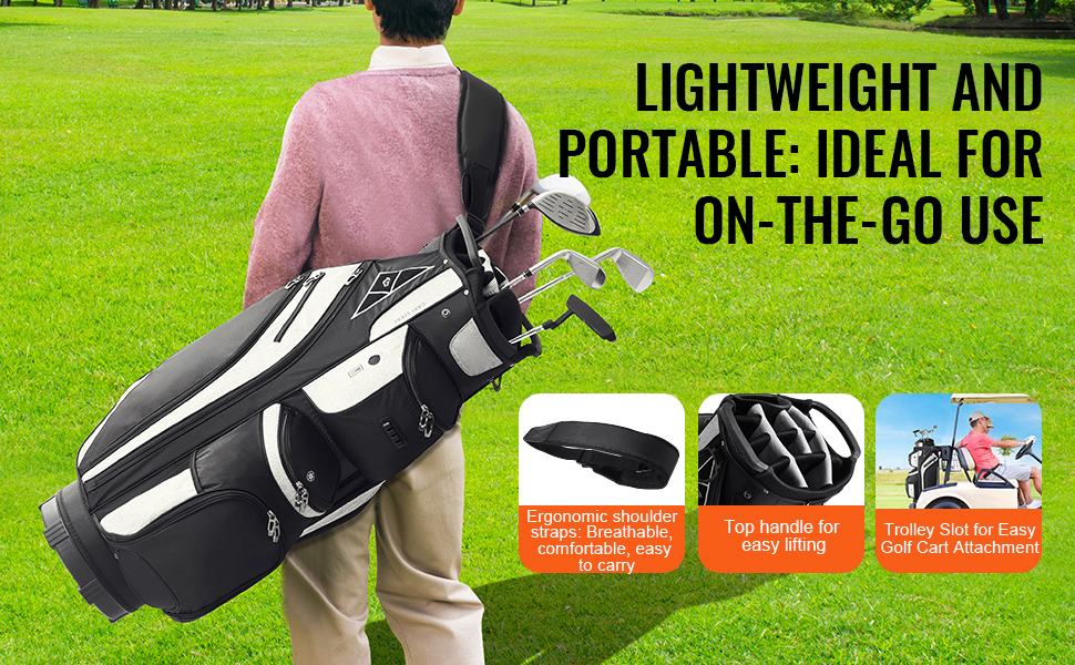 • Comfortable and Portable Design: Our golf bag comes with ergonomic shoulder straps that are comfortable, breathable, and lightweight, facilitating easy carrying. The top handle enables effortless lifting, and the bag can be firmly fixed on a golf cart for smooth mobility on the course. The dust cover keeps the bottom of your clubs clean from dirt and dust