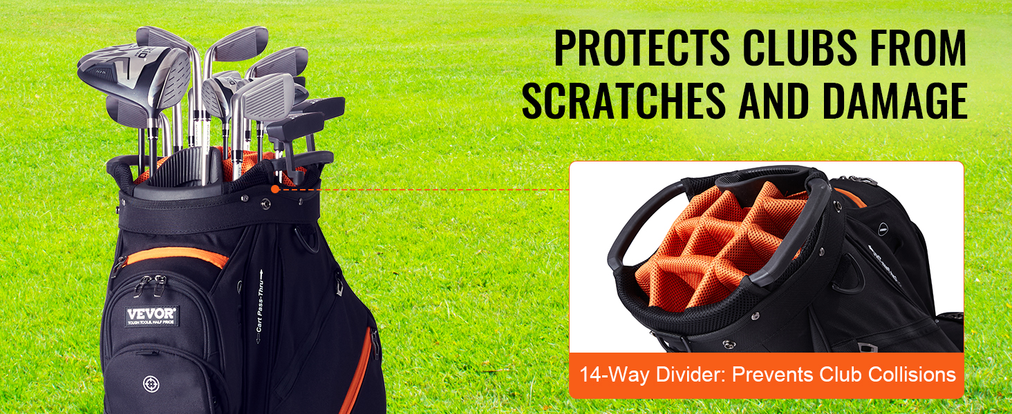 Thickened Golf Bag, Waterproof and Durable. Featuring a 14-way divider system and multiple pockets, our golf bag allows you to store your clubs in separate compartments and organize various sports items. Making your golf training more convenient and worry-free!
