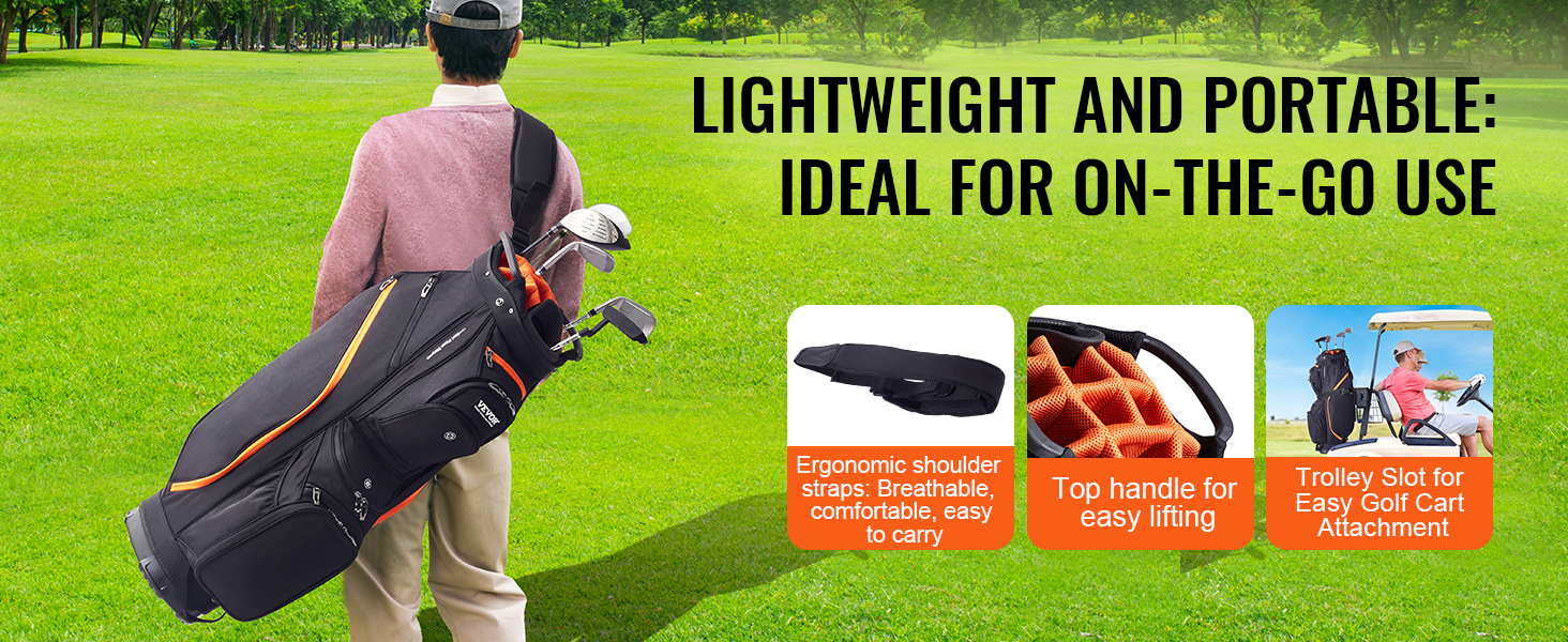• Comfort and Portability:The bag has ergonomic shoulder straps that are comfy, breathable, and light. The handle allows easy lifting, and it can be fixed on a cart. The dust cover keeps clubs clean.